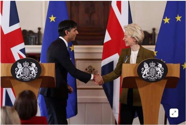 Ο πρωθυπουργός της Βρετανίας Ρίσι Σούνακ εξέφρασε την ικανοποίησή του για «ένα νέο κεφάλαιο» στις σχέσεις ανάμεσα στο Λονδίνο και την Ευρωπαϊκή Ενωση χάρη στην επίτευξη συμφωνίας για την μετά το Brexit τροποποίηση των διευθετήσεων για την Βόρεια Ιρλανδία έπειτα από μήνες έντασης. «Είναι η αρχή ενός νέου κεφαλαίου στις σχέσεις μας», δήλωσε ο Ρίσι Σούνακ ανακοινώνοντας την επίτευξη της συμφωνίας αυτής κατά την διάρκεια κοινής συνέντευξης Τύπου με την πρόεδρο της Ευρωπαϊκής Επιτροπής Ούρσουλα φον ντερ Λάιεν στο Γουίνδσορ.