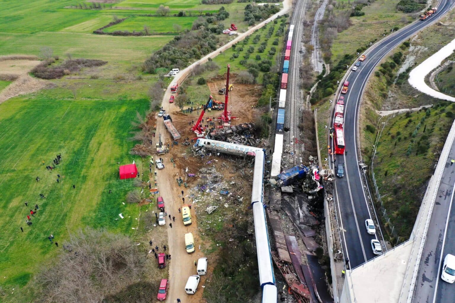 Σύμφωνα με την ανακοίνωση της Πυροσβεστικής, “Η επιχείρηση έρευνας και απεγκλωβισμού από το σημείο του σιδηροδρομικού δυστυχήματος είναι σε εξέλιξη. Έχουν ολοκληρωθεί οι εργασίες στο βαγόνι – εστιατόριο της επιβατικής αμαξοστοιχίας, το οποίο, από τη σφοδρότητα της σύγκρουσης, βρέθηκε πάνω σε άλλα 2 βαγόνια. Με τη βοήθεια γερανοφόρων οχημάτων, μετακινήθηκε στο έδαφος και ελέγχθηκε. Θα πρέπει να τονίσουμε ότι, στο συγκεκριμένο βαγόνι, ξέσπασε πυρκαγιά και αναπτύχθηκαν ιδιαίτερα υψηλές θερμοκρασίες, που έφθασαν ακόμη και τους 1300 βαθμούς κελσίου, γεγονός, που δυσκολεύει την ταυτοποίηση των ατόμων που βρίσκονταν εντός.”