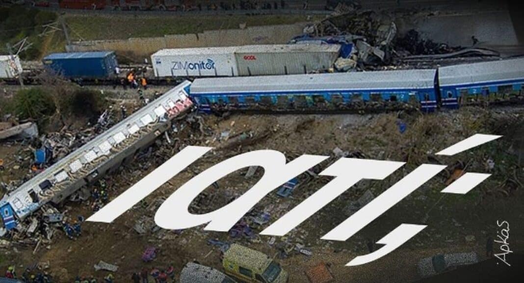 Ο Αρκάς διατυπώνει ένα τεράστιο «Γιατί» για την τραγωδία στα Τέμπη. Το «Γ» σχηματίζεται από την εκτροχιασμένη αμαξοστοιχία.
