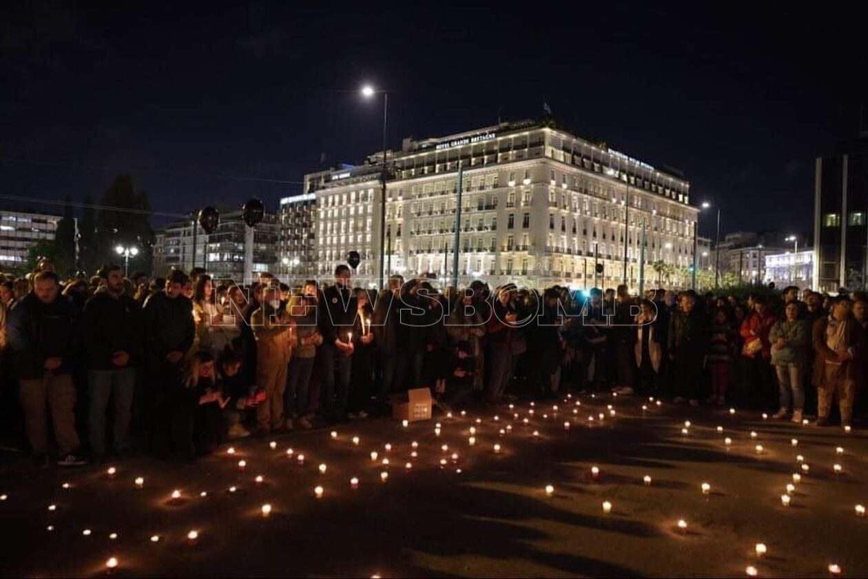 Πλήθος κόσμου αφήνει κεριά μπροστά από τη Βουλή των Ελλήνων στο Σύνταγμα στη μνήμη των θυμάτων της τραγωδίας των Τεμπών