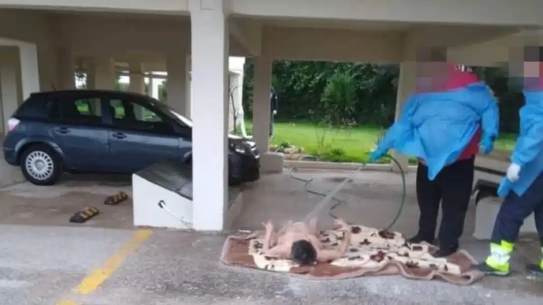 Δύο νοσηλευτές από ασθενοφόρο εμφανίζονται να «πλένουν» με λάστιχο μια γυναίκα γυμνή πάνω σε μια κουβέρτα. Όλα αυτά σε κοινή θέα στην πυλωτή μιας πολυκατοικίας.