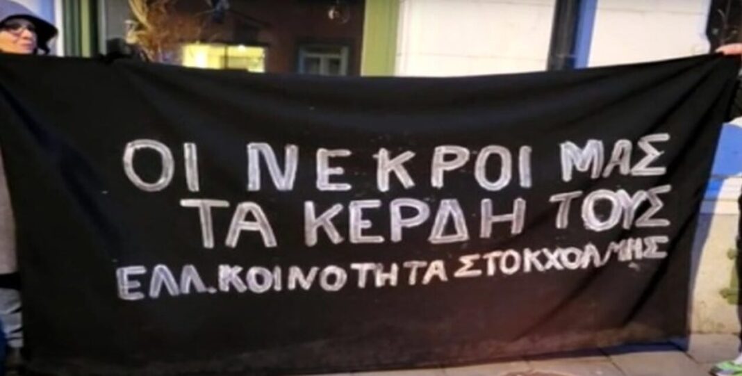 «Οι νεκροί μας τα κέρδη τους» έγραψαν σε μαύρα πανό τα μέλη της Ελληνικής Κοινότητας Στοκχόλμης, που χθες στις 18.00 το απόγευμα απαίτησαν έξω απ’ την ελληνική Πρεσβεία στη Σουηδία, δικαίωση. Η απόφαση για την κινητοποίηση πάρθηκε μια μέρα νωρίτερα στο περιθώριο των αρχιερεσιών για την ανάδειξη νέου προεδρείου. Εκεί, το σώμα εξέδωσε ανακοίνωση που μεταξύ άλλων αναφέρει: