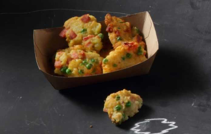 Βράζουμε για 15 λεπτά σε μπόλικο αλατισμένο νερό τον αρακά (κατεψυγμένο) και τις πατάτες. Στραγγίζουμε και αδειάζουμε σε μπολ. Με ένα πιρούνι λιώνουμε τις πατάτες και τον αρακά, προσθέτουμε το ζαμπόν, τα αυγά, το αλεύρι και το αλάτι και ανακατεύουμε. Ζεσταίνουμε το ελαιόλαδο και ρίχνουμε κουταλιές από το μείγμα. Τηγανίζουμε τους πατατοκεφτέδες για 2-3 λεπτά από κάθε πλευρά μέχρι να ροδίσουν. Τρώγονται ζεστοί (στο σπίτι) ή σε θερμοκρασία δωματίου (στο σχολείο).