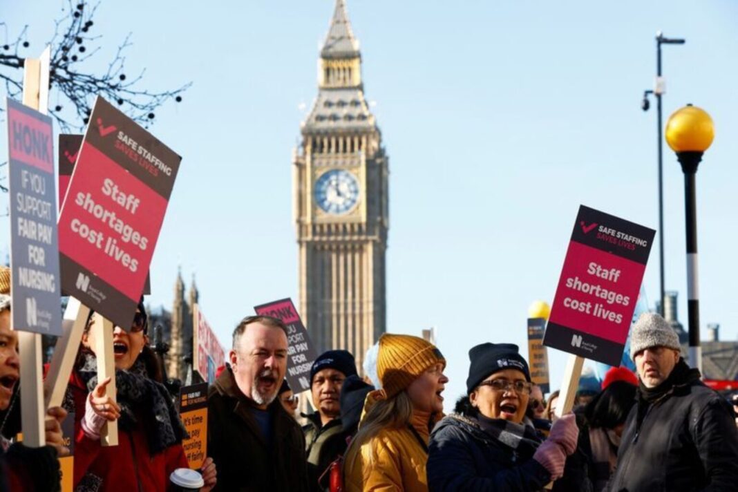 Χιλιάδες διαδηλωτές πραγματοποίησαν πορεία μέσω του Λονδίνου προς την κατοικία του Βρετανού πρωθυπουργού το Σάββατο για να στηρίξουν τους εργαζομένους στον τομέα της υγείας που έχουν πραγματοποιήσει μια σειρά απεργιών για τους μισθούς και τις συνθήκες στην Εθνική Υπηρεσία Υγείας που χρηματοδοτείται από το κράτος. Σχεδόν 40.000 κατώτεροι γιατροί, που αποτελούν τη ραχοκοκαλιά της νοσοκομειακής περίθαλψης, πρόκειται να αποχωρήσουν σε όλη την Αγγλία για τρεις ημέρες από τη Δευτέρα.