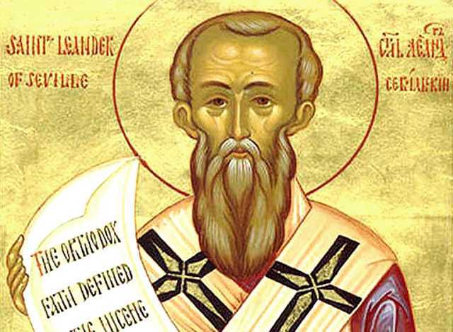 Ο Άγιος Λέανδρος, Επίσκοπος Σεβίλλης της Ισπανίας, διδάσκαλος της Εκκλησίας και φωτιστής των Ισπανών, έζησε τον 6ο μ.Χ. αιώνα και ήταν γόνος αριστοκρατικής οικογενείας. Ο πατέρας του ήταν δούκας και καταγόταν από βυζαντινή γενιά, ενώ η μητέρα του ήταν πρωτότοκη κόρη του Βησιγότθου βασιλέως Λεβιγκίντ, που βασίλευε στην Σεβίλλη, την πρωτεύουσα του βασιλείου των Βησιγότθων.