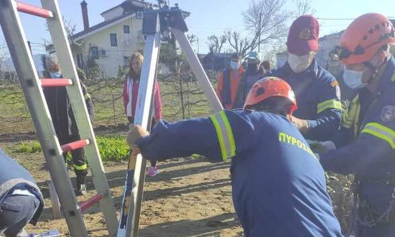 Αμέσως ξεκίνησε η επιχείρηση διάσωσης με τη χρήση ιμάντων, ενώ κλήθηκε και μηχάνημα του Δήμου Λαρισαίων για να διευκολύνει.