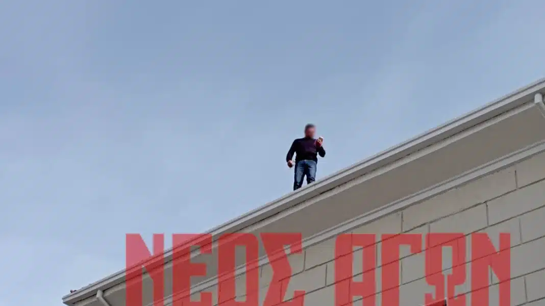 Ο άνδρας βρίσκεται από τις 09.20 στην οροφή και δηλώνει πως θα πέσει στο κενό, εάν δεν αντιμετωπιστεί το πρόβλημα που αντιμετωπίζει.
