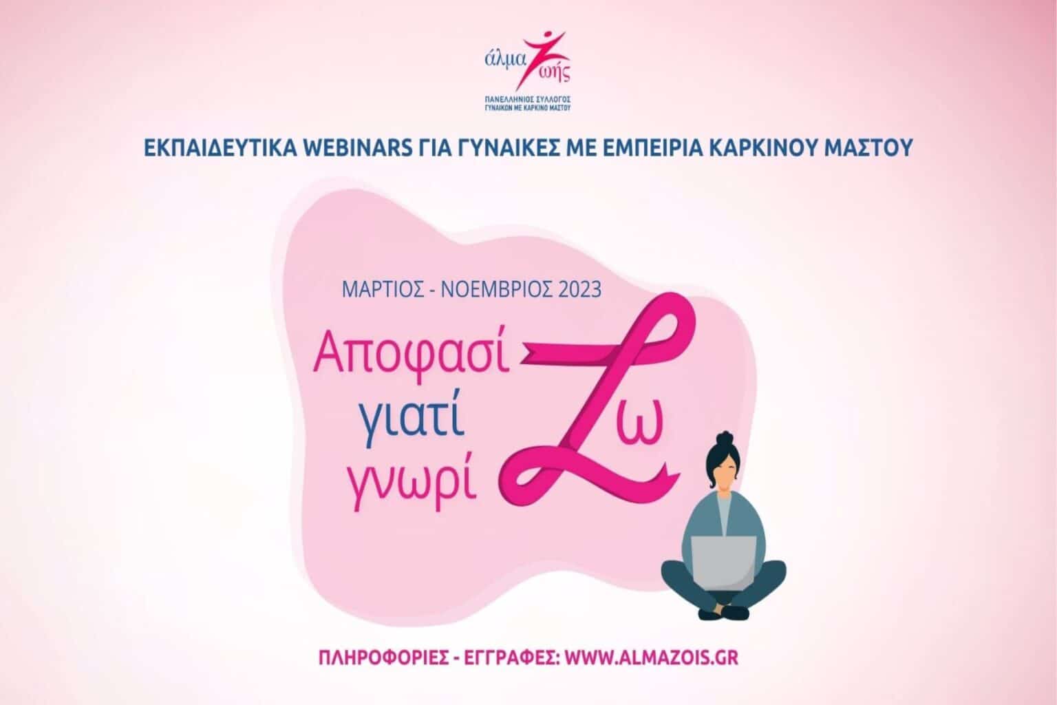 Ο Πανελλήνιος Σύλλογος Γυναικών με Καρκίνο Μαστού «Άλμα Ζωής» διοργανώνει για ακόμα μια χρονιά τα εκπαιδευτικά σεμινάρια για τον καρκίνο του μαστού «Αποφασίζω γιατί Γνωρίζω». Δίνοντας έμφαση στη σημασία της εμπεριστατωμένης ενημέρωσης γύρω από τον καρκίνο του μαστού, τα σεμινάρια στοχεύουν στην παροχή επιστημονικής πληροφόρησης από εξειδικευμένους ομιλητές, για θέματα που αφορούν στη ζωή μετά τη διάγνωση και τη θεραπεία της ασθένειας. Το πρόγραμμα πραγματοποιείται διαδικτυακά, μέσω της πλατφόρμας zoom, δίνοντας την ευκαιρία σε ασθενείς από όλη την Ελλάδα να πάρουν μέρος.