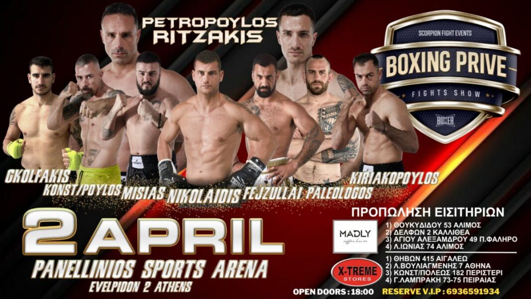 Στις 2 Απριλίου Θοδωρής Ριτζάκης και Κωνσταντίνος Πετρόπουλος μπαίνουν στο ρινγκ του Πανελληνίου για το Scorpion Boxing Prive. Ένας αγώνας στα 72,5 κιλά, διάρκειας 4 γύρων, πολυαναμενόμενος, με “κοκκινοπράσινη” απόχρωση (ο Ριτζάκης αθλητής του ς Παναθηναϊκού, ο Πετρόπουλος του Ολυμπιακού), με δύο από τους καλύτερους πυγμάχους μας στην κατηγορία. Διαβάστε περισσότερα