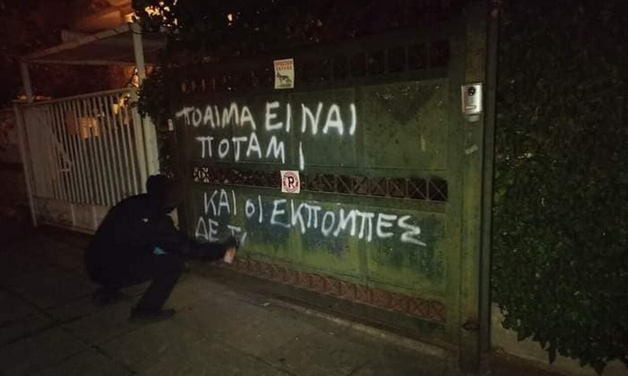 Όπως φαίνεται σε φωτογραφίες που δημοσίευσαν, τα μέλη του Ρουβίκωνα έγραψαν συνθήματα στην εξώπορτα του σπιτιού.