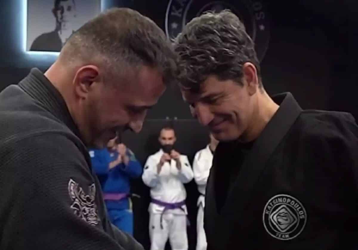 Ο Σάκης Ρουβάς, ως γνωστόν, εδώ και χρόνια “μαθητεύει” στο πλάι του Γιώργου Κατσινόπουλου, ανεβαίνοντας σιγά σιγά τις βαθμίδες του Μπραζίλιαν Ζίου Ζίτσου, σκουραίνοντας το χρώμα των ζωνών στη μέση του. Ο χρόνος είχε φτάσει πλέον για την απονομή της μωβ ζώνης και τηρήθηκε, όχι πιστά βέβαια μιας και συνοδεύτηκε από το τραγούδι του γνωστού …