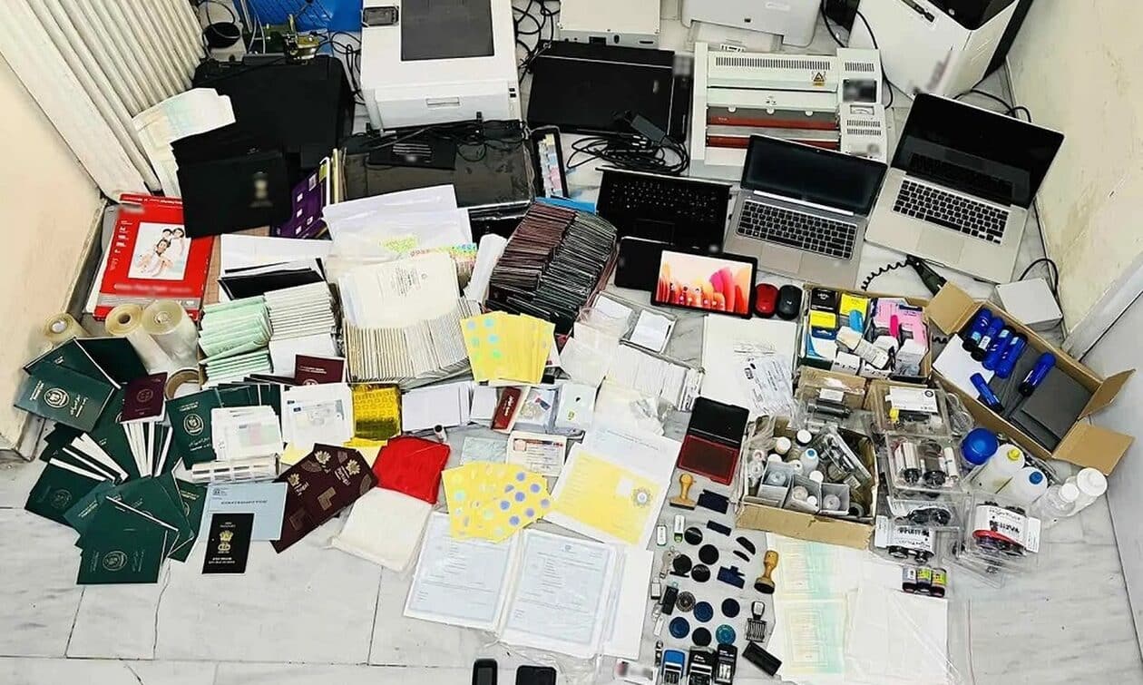 Συγκεκριμένα, το μεσημέρι της Παρασκευής (24/3) εντοπίστηκε από τους αστυνομικούς ο 51χρονος στην πλατεία Βικτωρίας και στην κατοχή του -και στο μηχανάκι του- βρέθηκαν και κατασχέθηκαν πλαστό διαβατήριο και χρηματικό ποσό. Κατά την έρευνα που ακολούθησε στο σπίτι του, εντοπίσθηκε και συνελήφθη ο 33χρονος κατηγορούμενος, ενώ μεταξύ άλλων βρέθηκαν και κατασχέθηκαν: 3 υπολογιστές, 2 tablet, -πλήθος πλαστών, κλεμμένων ή δηλωμένων ως απωλεσθέντων εγγράφων, διαφόρων χωρών (διαβατήρια, άδειες διαμονής, κάρτες κ.α.), – εξοπλισμός κατάρτισης πλαστών εγγράφων (εκτυπωτές, συσκευές πλαστικοποίησης, κόφτες φωτογραφιών κ.ά.), εξώφυλλα διαβατηρίων διάφορων χωρών και μήτρες εγγράφων, 24 σφραγίδες Δημόσιων Αρχών και προσώπων.