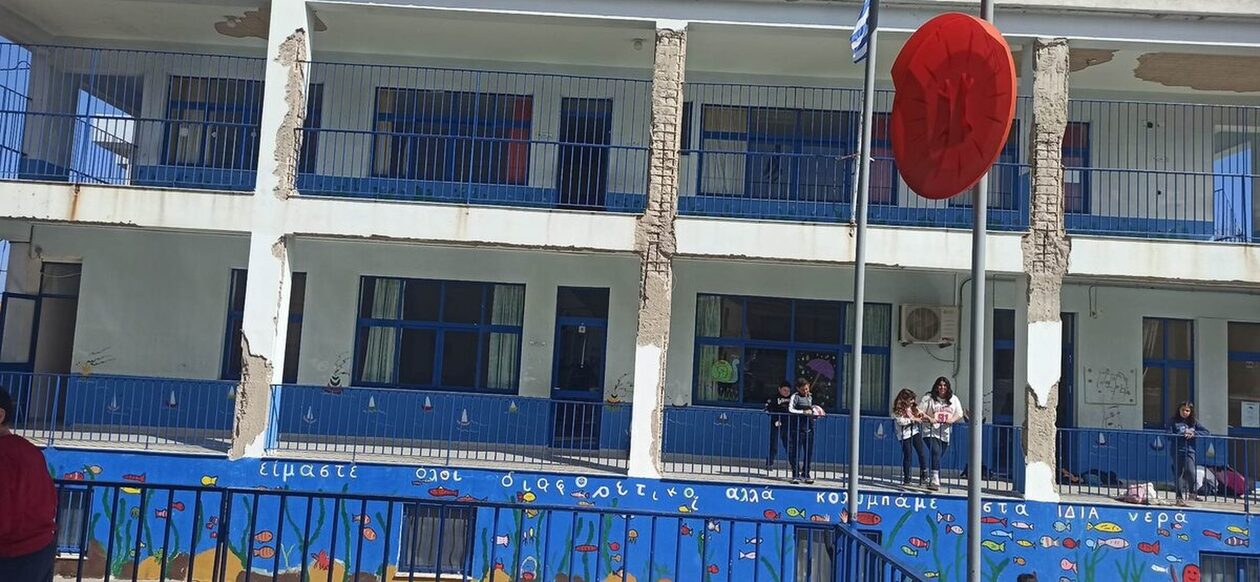 Αυτό το σχολείο βρίσκεται στο δήμο της Χίου! παραπλεύρως αυτού του κτηρίου υπάρχει ακόμη ένα κτήριο παλαιότερο (περί των 90 ετών), το οποίο βρίσκεται σε ακόμη χειρότερη κατάσταση! από την πρώτη μέρα που πήγαμε το παιδί μας να φοιτήσει, δεν σταμάτησα να προσπαθώ να εξηγήσω τα αυτονόητα (δεχόμενη μονίμως αδιαφορία και συχνά χλευασμό!)! Ως κηδεμονεύουσα και Πολιτικός Μηχανικός στο επάγγελμα, θεώρησα υποχρέωσή μου να καταθέσω τεύχος πολλών σελίδων με τεχνική τεκμηρίωση όλων των προβλημάτων του κτηριακού συγκροτήματος στη διεύθυνση του σχολείου, την Τεχνική υπηρεσία και στην Πρωτοβάθμια Εκπαίδευση! Όλοι ανεξαιρέτως με αγνόησαν και μεταβίβαζαν τις ευθύνες, ενώ δεν έλαβα καμία απάντηση! Στο άλλο κτήριο (που δεν βλέπετε στις φωτογραφίες), οι οπές στους τοίχους (φέρουσα τοιχοποιία), ήταν της τάξεως των 10-20 εκατοστών καθ’ ύψος και βάθος, ενώ είχε ανασηκωθεί όλο το δάπεδο του ισογείου! Στο κτήριο που βλέπετε υπάρχει υπόγειο με λεβητοστάσιο, χωρίς καμία οδό ασφαλούς διαφυγής, στο οποίο επί 11 χρόνια κρατούνταν επί 2ωρο καθημερινά τα παιδιά που παρακολουθούν το ολοήμερο τμήμα!!! Όταν ζήτησα να απομακρυνθούν από εκεί, δέχθηκα την αγανάκτηση και φυσικά θυμό από δασκάλους και γονείς! Τελικά με ίδιες ενέργειες 5 γονιών δημιουργήσαμε χώρο στο ισόγειο αυτού του κτηρίου για να μεταφερθεί αυτή η αίθουσα από το υπόγειο! Και έπειτα από όλα αυτά επήλθε ο σεισμός της Σάμου-Χίου! Δόξα τω Θεώ! Μετά το σεισμό και με πιέσεις μας προς την τεχνική υπηρεσία κρίθηκε ακατάλληλο το κτήριο (όχι αυτό της φωτογραφίας) και αναμένουμε (για χρόνια προφανώς), τις μελέτες και τη στατική ενίσχυση!!! Το κτήριο της φωτογραφίας είναι έτσι επί διετία, καθώς άρχισαν να πέφτουν οι σοβάδες (όχι λόγω σεισμού, αλλά χρόνιας μη συντήρησης)! Μετά την πρόχειρη καθαίρεση των σοβάδων (προ διετίας) η κατάσταση παραμένει αυτή, χωρίς καν μια διαδικασία τμηματικής επισκευής έως ότου να ολοκληρωθούν οι μελέτες για το συνολικό κτηριακό συγκρότημα! Μετά το σεισμό τοποθετήθηκαν στο προαύλιο αυτού του σχολείου 4 κοντέινερς! Η γενική κατάσταση του σχολείου είναι πολύ άσχημη, αλλά ουδείς μοιάζει να αντιλαμβάνεται τον κίνδυνο! Δεν ευθύνονται μόνο οι αρμόδιοι, αλλά και εμείς που δεν ενεργούμε ή προτιμούμε την αδιαφορία γιατί κάπου βολευτήκαμε!