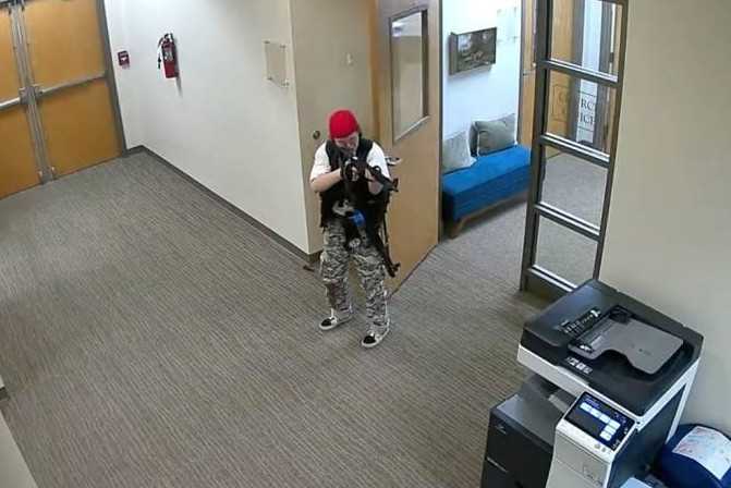 Η φόνισσα μπήκε στο παλιό της σχολείο πυροβολώντας και κάνοντας κομμάτια γυάλινη πόρτα. Πλάνα από το κλειστό κύκλωμα παρακολούθησης εικονίζουν μια σιλουέτα βαριά οπλισμένη καθώς μπαίνει στο κτίριο.