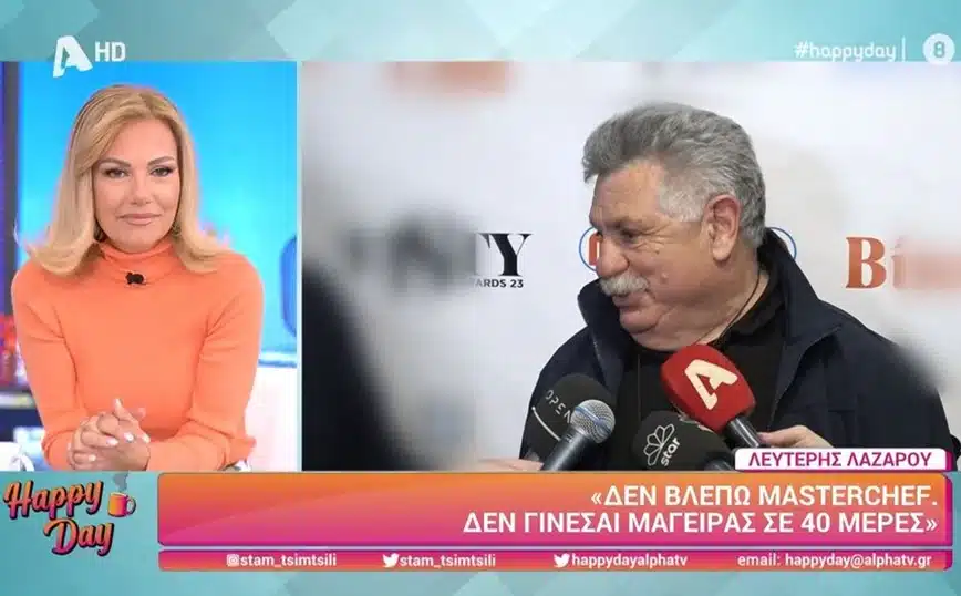 Δεν βλέπει MasterChef ο Λευτέρης Λαζάρου όπως είπε στους δημοσιογράφους στο πλαίσιο των Happy Tasty Awards 2023. «Όχι, δεν βλέπω MasterChef γιατί είναι σε ώρες που δεν… Κάτι τρέιλερ πετυχαίνω στο ζάπινγκ. Όχι, δεν βλέπω. Δεν φτάνουν οι γνώσεις από ένα τηλεοπτικό ριάλιτι για να γίνει κάποιος μάγειρας» είπε. «Η μαγειρική θέλει πολύ χιλιόμετρο. Δεν γίνεται μέσα σε έναν κύκλο 30-40 ημερών να γίνεις μάγειρας. Μάγειρας, το σεφ αφήστε το», είπε ο Λευτέρης Λαζάρου.