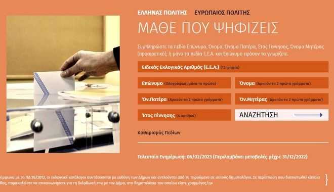Οι πολίτες μπορούν με λίγα μόλις βήματα να μάθουν σε ποιο εκλογικό κέντρο θα ψηφίσουν, μέσα από την ιστοσελίδα του Υπουργείου Εσωτερικών, συμπληρώνοντας τα στοιχεία τους στην ειδική σχετική φόρμα με τίτλο “Μάθε πού ψηφίζεις”.
