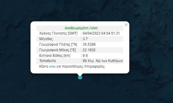 Συγκεκριμένα ο σεισμός καταγράφηκε στις 7:54 το πρωί από το Εθνικό Αστεροσκοπείο του Γεωδυναμικού Ινστιτούτου Αθηνών, 99 χιλιόμετρα νοτιοδυτικά των Κυθήρων.
