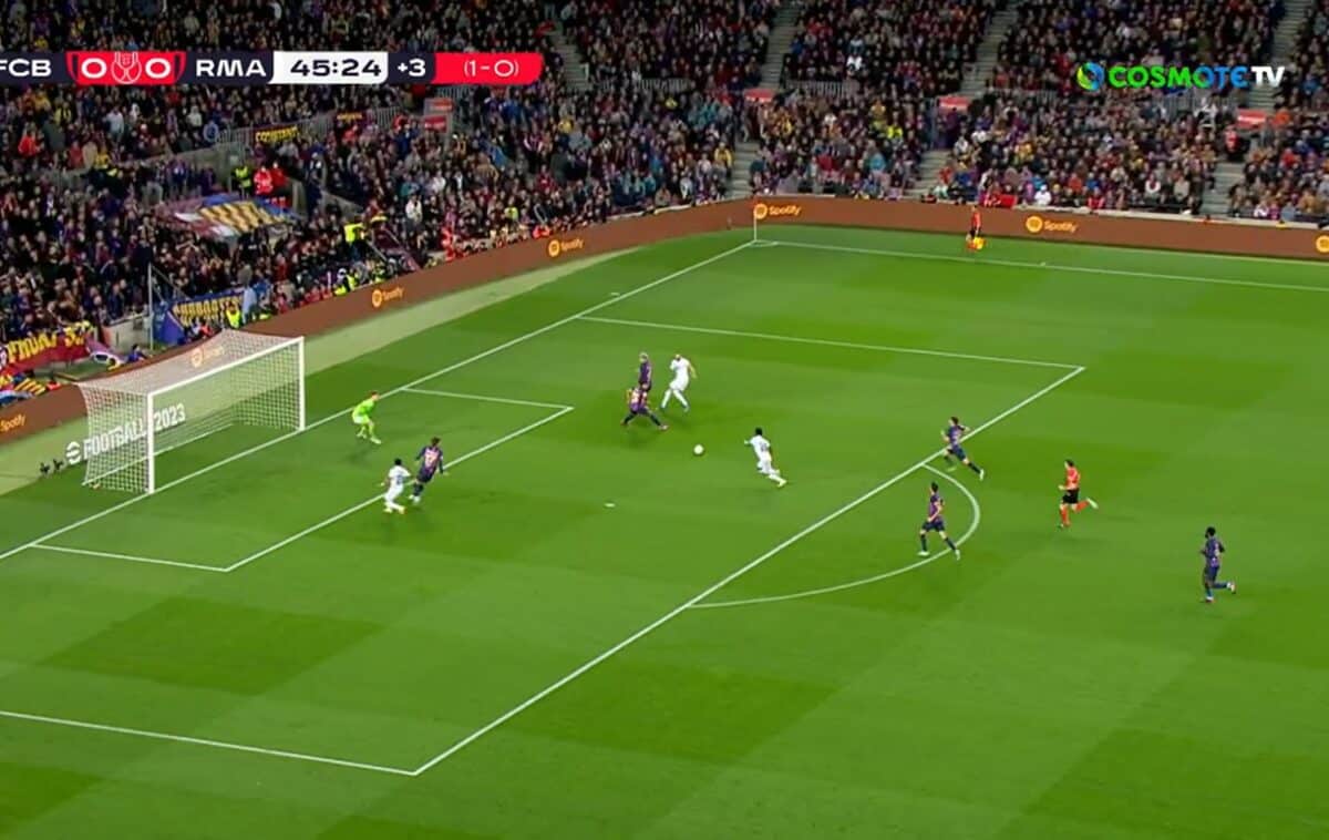 Η Ρεάλ ανοίγει το σκορ στην Καταλωνία κόντρα στην Μπαρτσελόνα με τον Βινίσιους ισοφαρίζοντας το σκορ του πρώτου ημιτελικού. Απότομη εναλλαγή συναισθημάτων στο «Καμπ Νου» με τον Κουρτουά να σώζει απέναντι στον Λεβαντόφσκι και τη Ρεάλ να κάνει το 0-1 στην κόντρα.