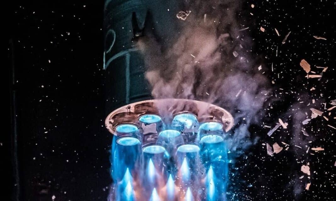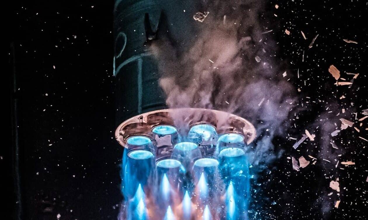 Σε αυτό το κοντινό πλάνο μιας εκτόξευσης του Terran 1 τη νύχτα της 22ας Μαρτίου από το ακρωτήριο Κανάβεραλ, φαίνονται παγωμένα κομμάτια να πέφτουν καθώς τα έντονα μπλε ρεύματα της εξάτμισης διακρίνονται στους εννέα κινητήρες του.