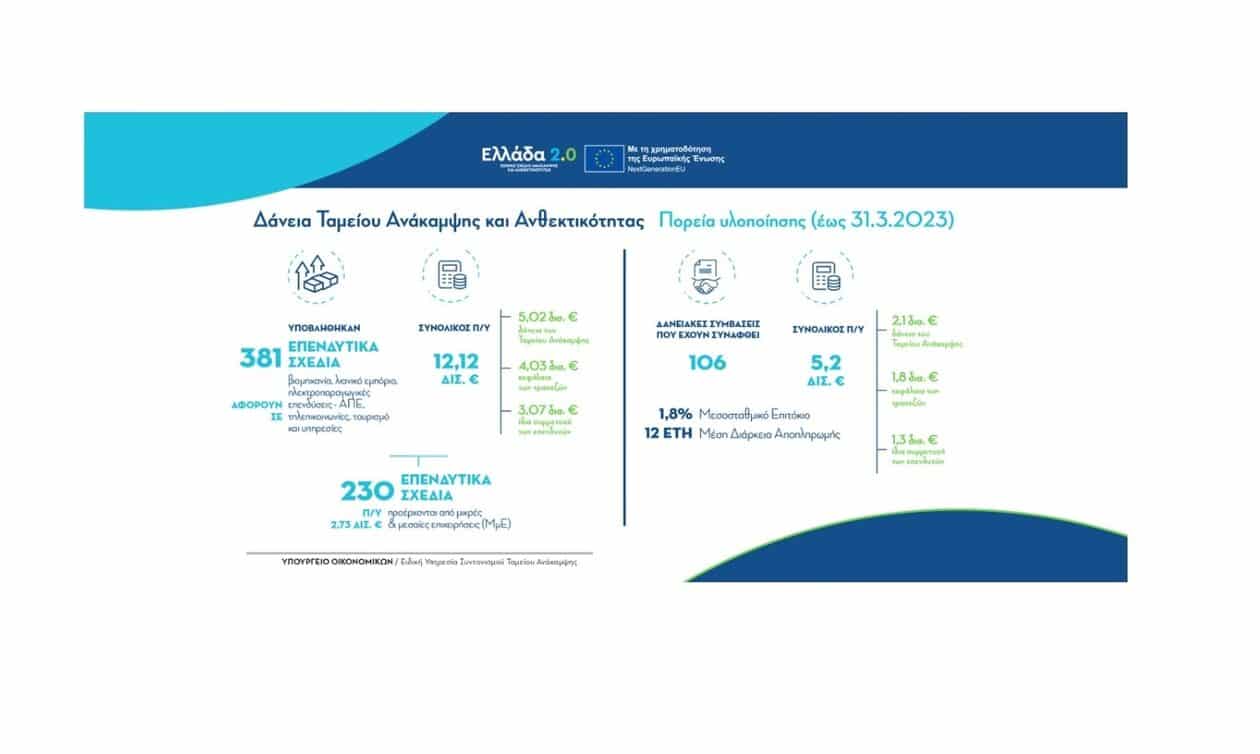 Μέχρι στιγμής, έχουν υποβληθεί 381 επενδυτικά σχέδια στο δανειακό σκέλος του Εθνικού Σχεδίου Ανάκαμψης και Ανθεκτικότητας (ΤΑΑ) «Ελλάδα 2.0», τα οποία έχουν συνολικό προϋπολογισμό 12,12 δισ. ευρώ.