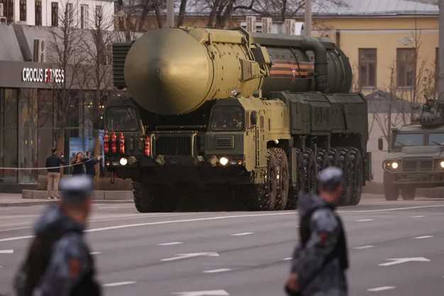 Στα τέλη Μαρτίου, ο Ρώσος πρόεδρος, Βλαντιμίρ Πούτιν, ανακοίνωσε ότι η Ρωσία προτίθεται να επαναφέρει τακτικά πυρηνικά όπλα μικρού βεληνεκούς στη Λευκορωσία, υπογραμμίζοντας για άλλη μια φορά την τρομακτική προοπτική της χρήσης τους στον πόλεμο της Ουκρανίας (στη φωτογραφία του Reuters/Maxim Shemetov, επάνω, διηπειρωτικός βαλλιστικός πύραυλος σε παρέλαση στη Μόσχα).