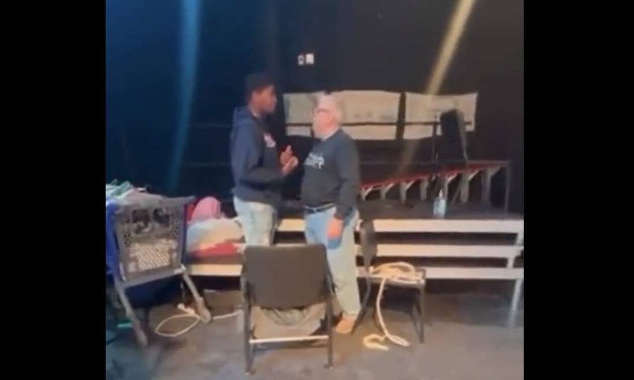 Τότε ο 15χρονος σηκώνει το χέρι του και γρονθοκοπεί τον καθηγητή ο οποίος προσπαθεί να κρατήσει την ισορροπία του.