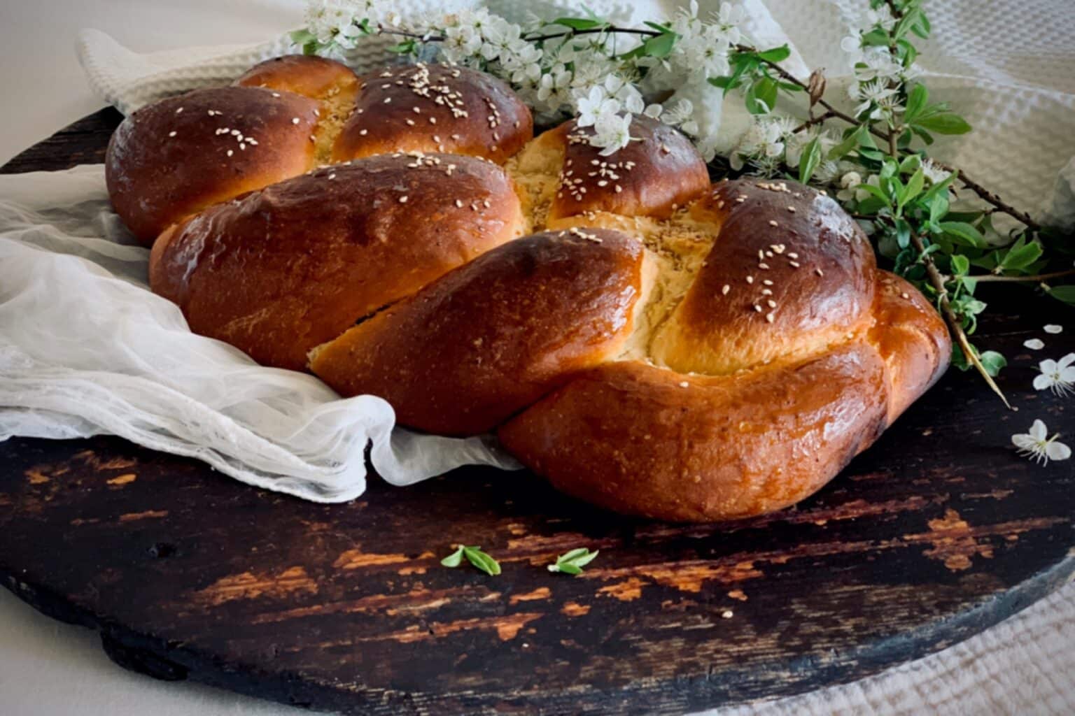 - Μεταφέρετε τη ζύμη στο φούρνο σας και ψήστε για 20 λεπτά. Βγάζουμε τη ζύμη από το φούρνο και την αλείφουμε με άλλη μια στρώση από το πλύσιμο των αυγών και στη συνέχεια την πασπαλίζουμε με σουσάμι. Επιστρέψτε το στο φούρνο σε περιστρεφόμενη θέση (έτσι ώστε να ψηθεί ομοιόμορφα) και στη συνέχεια ψήστε το για άλλα 20-30 λεπτά, μέχρι να ροδίσει σε όλο το μήκος (ένα θερμόμετρο θα πρέπει να δείχνει τουλάχιστον 90 βαθμούς στο κέντρο του ψωμιού). Αφήστε το να κρυώσει σε μια σχάρα πριν το κόψετε και το σερβίρετε.