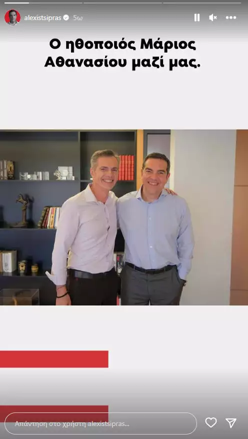 «Με το ΣΥΡΙΖΑ ταυτίζεται το όραμα για μια κοινωνία όπως την φαντάζομαι. Σέβομαι την πολιτική θέση του καθενός και δεν αντιλαμβάνομαι κανένα ως αντίπαλο», είχε γράψει ο Μάριος Αθανασίου στο προσωπικό του προφίλ στο instagram.