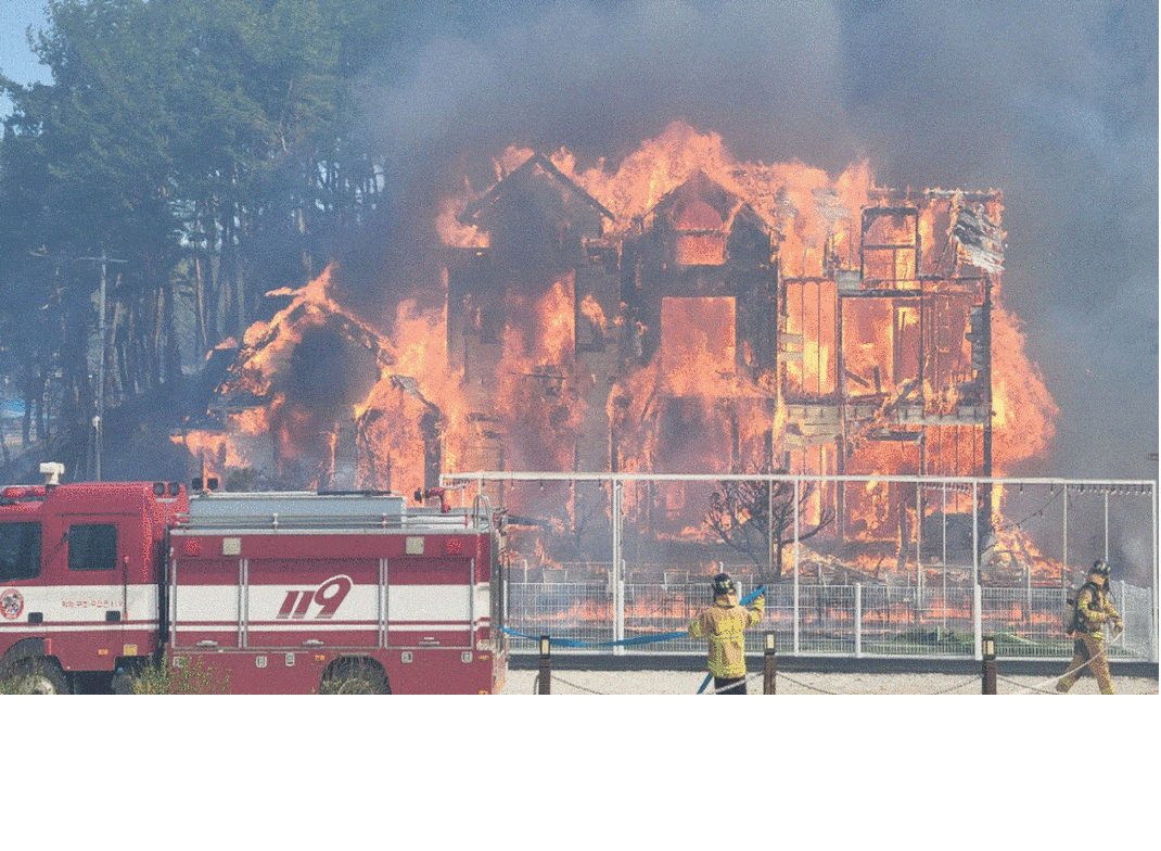 Εκατοντάδες Νοτιοκορεάτες αναγκάστηκαν να εγκαταλείψουν τις εστίες τους, μετά απο πυρκαγιά που πυροδοτήθηκε από τους ισχυρούς ανέμους και έκαψε τμήματα μιας ανατολικής παράκτιας πόλης την Τρίτη, καταστρέφοντας δεκάδες σπίτια.