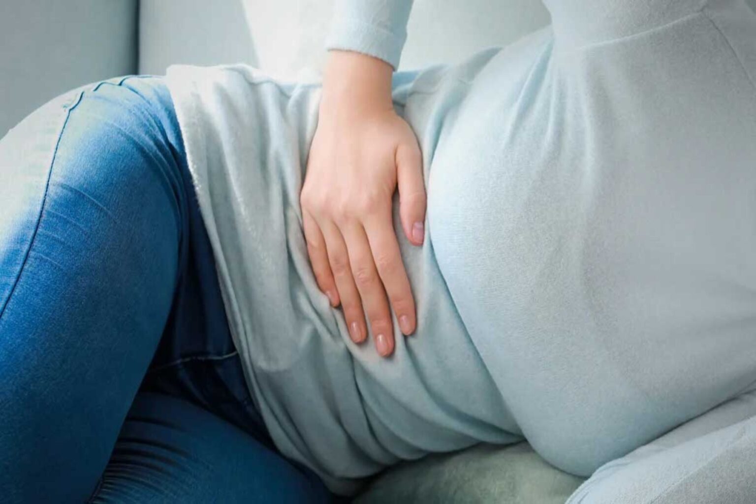 Abdominal pain woman, photo of large intestine on woman body, appendix pain. Health care concept.