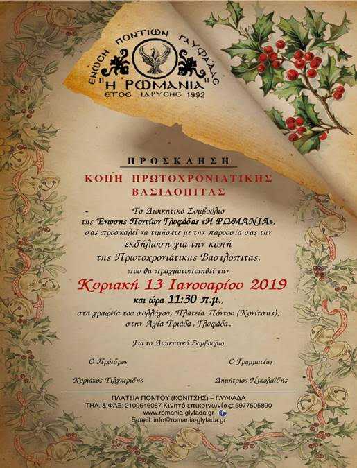 Μαζί με τις ολόθερμες ευχές μας για Καλή και ευλογημένη Χρονιά, σας προσκαλούμε στην εκδήλωση για την κοπή της Πρωτοχρονιάτικης Βασιλόπιτας, η οποία θα πραγματοποιηθεί την Κυριακή 13 Ιανουαρίου 2019 και ώρα 11:30 π.μ., στην αίθουσα των γραφείων του συλλόγου μας Πλατεία Πόντου (πρώην Κονίτσης) Αγία Τριάδα – Γλυφάδα.
