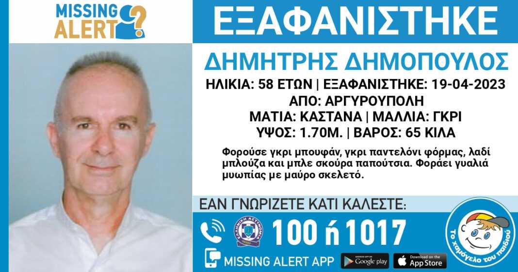 Στις 19 Απριλίου 2023, εξαφανίστηκε από την περιοχή της Αργυρούπολης στην Αθήνα, ο Δημήτρης Δημόπουλος, 58 ετών. Το «Χαμόγελο του Παιδιού» ενημερώθηκε για την εξαφάνιση του Δημήτρη Δημόπουλου στις 20/04/2023 και άμεσα προχώρησε στη δημοσιοποίηση των στοιχείων του ενήλικου κατόπιν αιτήματος των οικείων του. Ο Δημήτρης Δημόπουλος έχει προβλήματα υγείας τα οποία χρήζουν άμεσης ιατρικής φροντίδας και θέτουν τη ζωή του σε κίνδυνο.