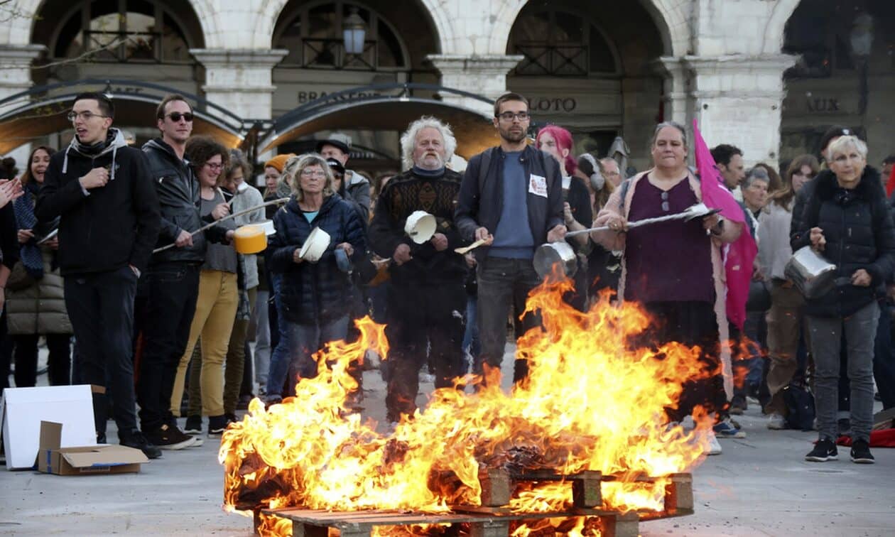 Τηγάνια και άλλα σκεύη χρησιμοποιήθηκαν επίσης από πλήθη διαδηλωτών για να διακόψουν την επίσκεψη του Μακρόν στην πόλη Muttersholtz την Τετάρτη. Ο Γάλλος πρόεδρος πραγματοποιεί περιοδεία αυτή τη στιγμή στη χώρα σε μια προσπάθεια συμφιλίωσης με το κοινό μετά την αμφιλεγόμενη μεταρρύθμιση των συντάξεων για την αύξηση της ηλικίας συνταξιοδότησης από τα 62 στα 64 έτη που έγινε επίσημα νόμος το περασμένο Σάββατο (15/4)