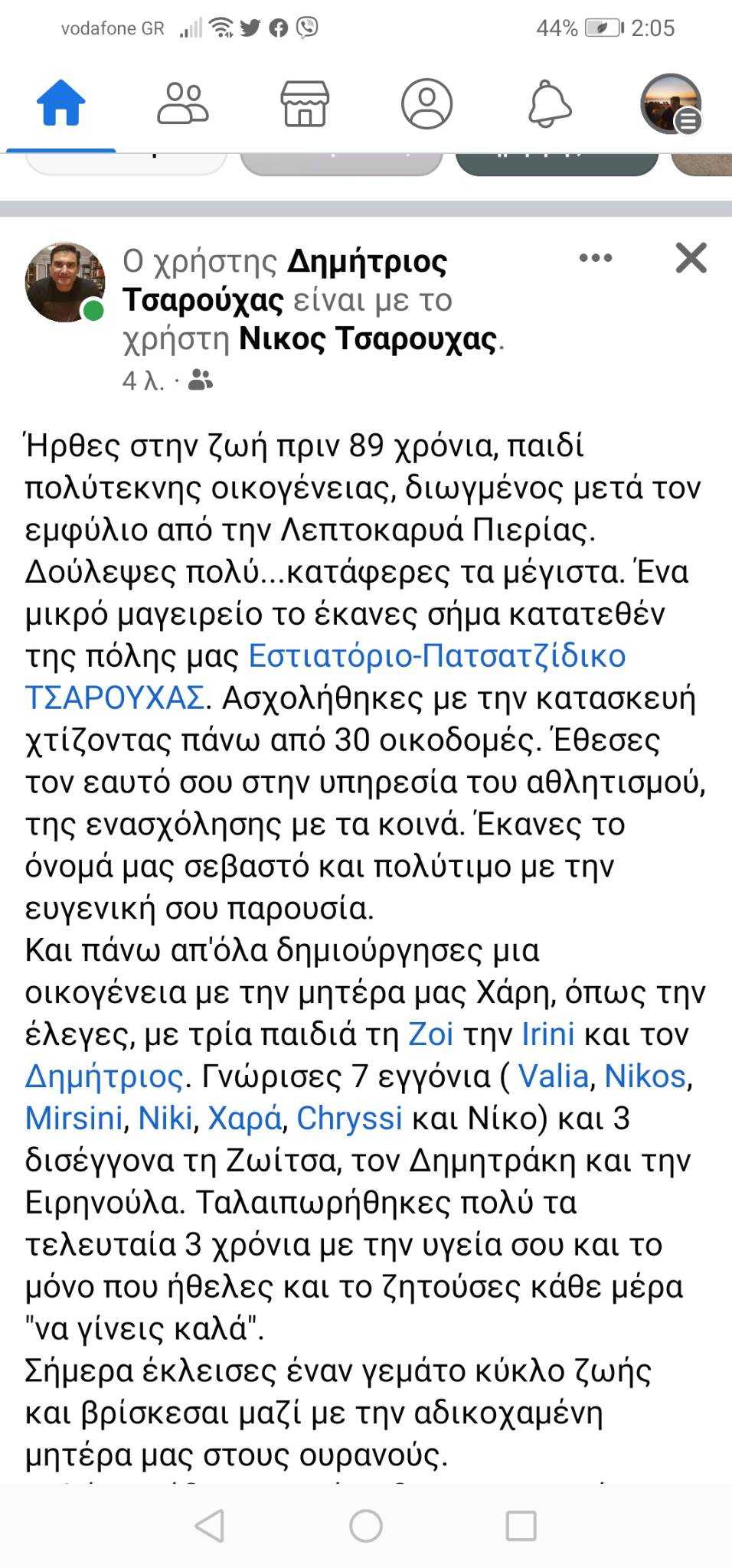 Η ανάρτηση του γιου του, Δημήτρη Τσαρούχα, συγκινεί: «Ήρθες στην ζωή πριν 89 χρόνια, παιδί πολύτεκνης οικογένειας, διωγμένος μετά τον εμφύλιο από την Λεπτοκαρυά Πιερίας. Δούλεψες πολύ, κατάφερες τα μέγιστα. Ένα μικρό μαγειρείο το έκανες σήμα κατατεθέν της πόλης μας Εστιατόριο-Πατσατζίδικο ΤΣΑΡΟΥΧΑΣ. Ασχολήθηκες με την κατασκευή χτίζοντας πάνω από 30 οικοδομές. Έθεσες τον εαυτό σου στην υπηρεσία του αθλητισμού, της ενασχόλησης με τα κοινά. Έκανες το όνομά μας σεβαστό και πολύτιμο με την ευγενική σου παρουσία.