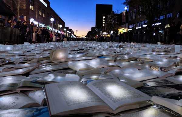 Έναν από τους κύριους δρόμους της πόλης Αν Άρμπορ στην Πολιτεία του Μίσιγκαν μετέτρεψε σε λαμπερό ποτάμι από 11.000 βιβλία, η ισπανική ομάδα σχεδιαστών luzinterruptus.