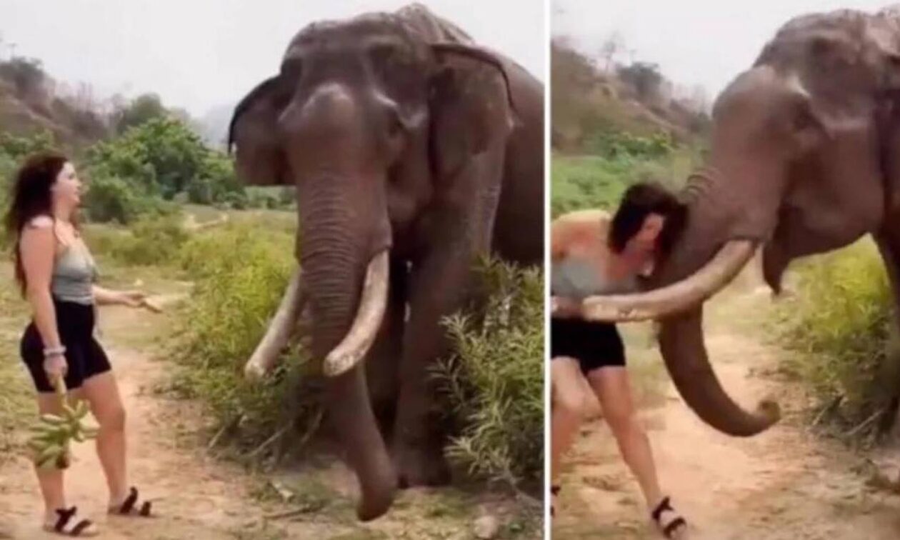Στο βίντεο που αναρτήθηκε στο Twitter φαίνεται η γυναίκα να κρατά μια μπανάνα μπροστά στην προβοσκίδα του εξημερωμένου κατά τα άλλα ελέφαντα, ο οποίος την πλησιάζει προσπαθώντας να δαγκώσει τη λιχουδιά. Χαμογελώντας η τουρίστρια τράβηξε πίσω την τελευταία στιγμή τη μπανάνα προκαλώντας την αντίδραση του ελέφαντα, ο οποίος τίναξε τους χαυλιόδοντες και την προβοσκίδα του τινάζοντας το θύμα του στον αέρα.