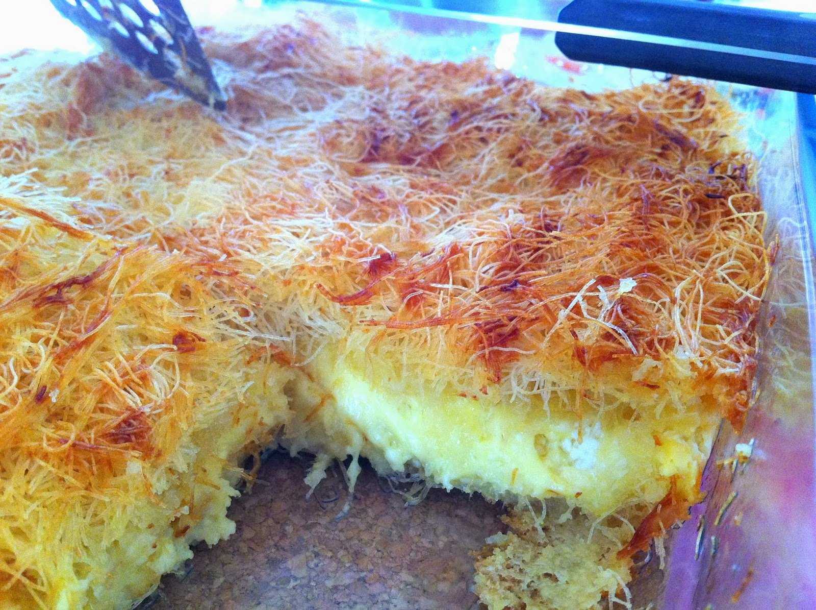 Βουτυρώνουμε ένα ταψί γύρω στα 36 εκατ , απλώνουμε το μισό κανταΐφι ομοιόμορφα παντού.