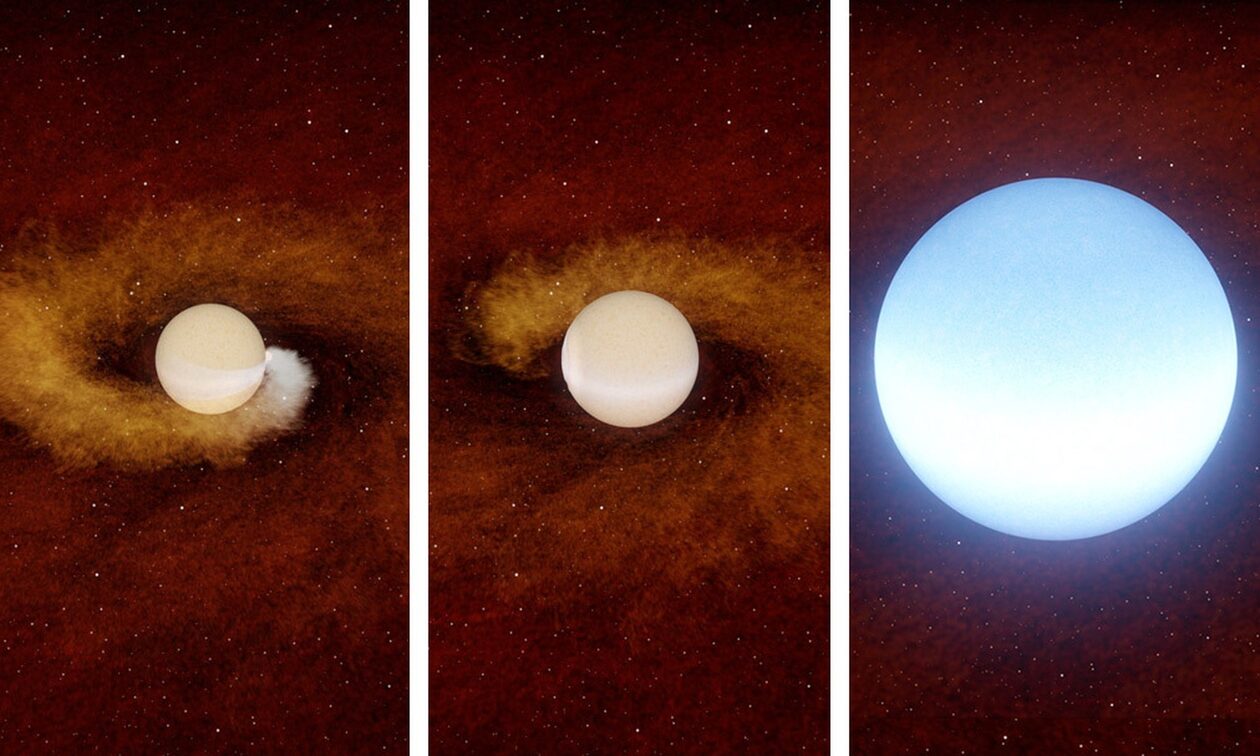 Η φωτεινή, καυτή λάμψη ήταν πιθανότατα οι τελευταίες στιγμές ενός πλανήτη μεγέθους Δία που τραβήχτηκε μέσα στην ατμόσφαιρα ενός ετοιμοθάνατου άστρου. Καθώς ο πλανήτης έπεφτε στον πυρήνα του άστρου, τα εξωτερικά στρώματα του άστρου εκτοξεύτηκαν και εξελίχθηκαν σε κρύα σκόνη.