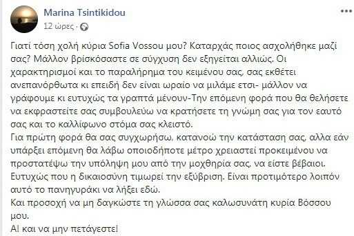 «Γιατί τόση χολή κύρια Sofia Vossou μου; Καταρχάς ποιος ασχολήθηκε μαζί σας; Μάλλον βρισκόσαστε σε σύγχυση δεν εξηγείται αλλιώς. Οι χαρακτηρισμοί και το παραλήρημα του κειμένου σας, σας εκθέτει ανεπανόρθωτα κι επειδή δεν είναι ωραίο να μιλάμε έτσι- μάλλον να γράφουμε κι ευτυχώς τα γραπτά μένουν-Την επόμενη φορά που θα θελήσετε να εκφραστείτε σας συμβουλεύω να κρατήσετε τη γνώμη σας για τον εαυτό σας και το καλλίφωνο στόμα σας κλειστό.