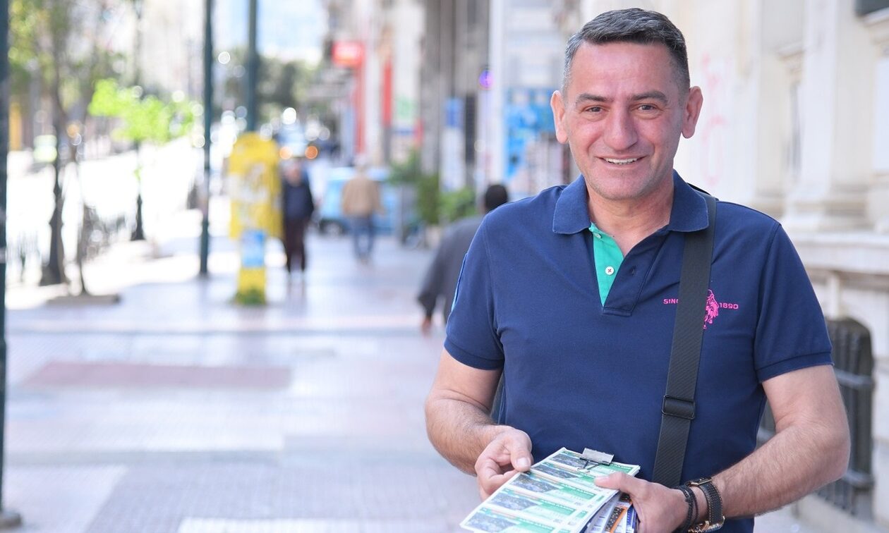 Στα 49 του χρόνια, βάζει τη δική του πινελιά στους δρόμους της πόλης από νωρίς το πρωί, δίνοντας μια διαφορετική προσέγγιση στο επάγγελμα του λαχειοπώλη που ξεφεύγει από την εικόνα που παραπέμπει σε παλιά ελληνική ταινία.