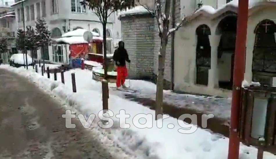 Αντί να βάλει αλυσίδες στο αυτοκίνητο επέλεξε να φορέσει τα πέδιλα του σκι για να κάνει τις δουλειές του στο κέντρο του Καρπενησίου