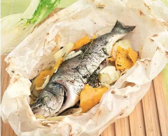 - Διπλώνετε τις λαδόκολλες σε πακέτα κλείνοντας μέσα τους τα λαχανικά και τα ψάρια. Αραδιάζετε τα πακέτα σε ταψί και τα ψήνετε στον προθερμασμένο φούρνο για 40 λεπτά.