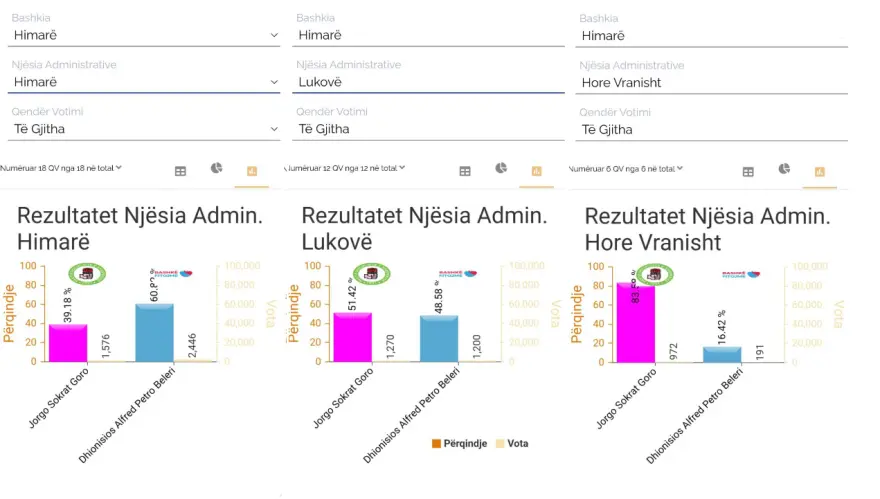 - Σύμφωνα με τα τελικά επίσημα στοιχεία, στην Δ.Ε. Χειμάρρας ο Μπελέρης έλαβε 2.446 ψήφος (61%) σε σχέση με τον Γκιόργκι Γκόρο που έλαβε 1.576 (39%),
