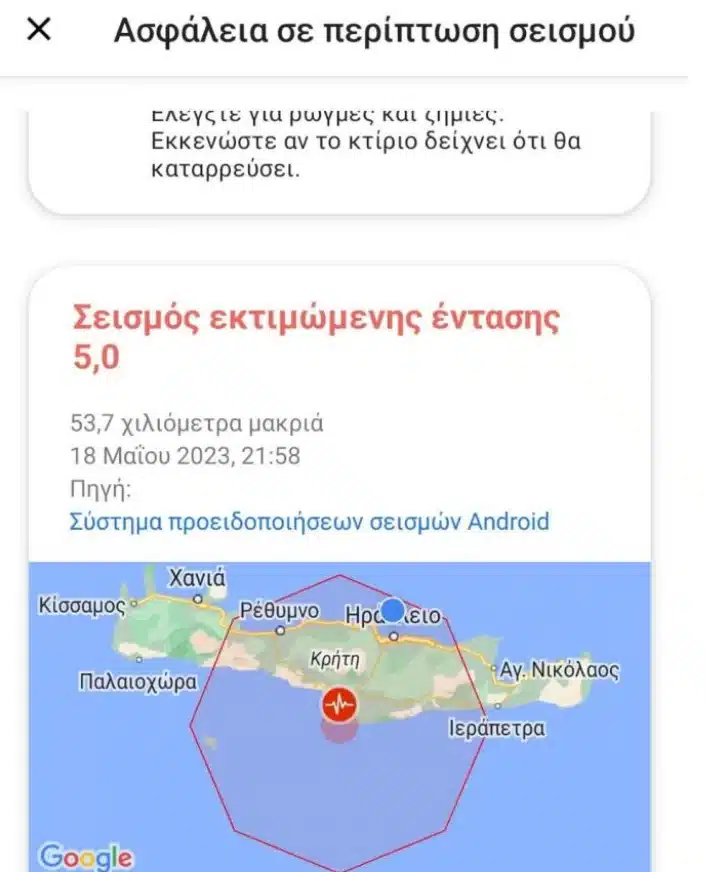 «Δυνατός σεισμός στη νότια Κρήτη μεγέθους 5,1 στις 21.58. Επίκεντρο σε χερσαίο χώρο 10 χλμ νοτιοδυτικά των Μοιρών. Προηγήθηκαν μερικοί μικρότεροι σεισμοί και χθες έγινε σεισμός μεγέθους 4,2 στην ίδια εστία. Επιβάλλεται πολύ προσεκτική παρακολούθηση και αξιολόγηση από τους επιστήμονες και μέτρα προστασίας από τις τοπικές αρχές, όπως προβλέπει το επιχειρησιακό Σχέδιο ΕΓΚΕΛΑΔΟΣ».