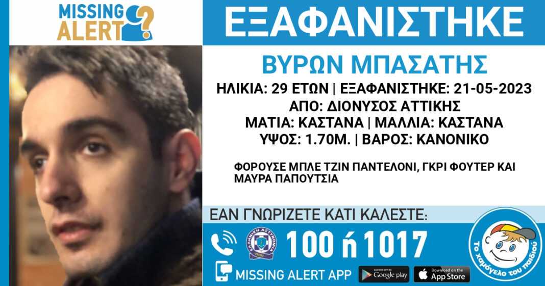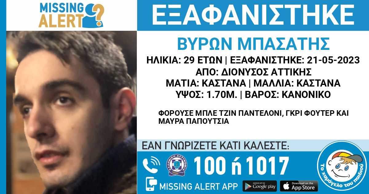 Πρόκειται για τον Βύρωνα Μπασάτη, 29 ετών, ο οποίος έχει καστανά μαλλιά, καστανά μάτια, ύψος 1,70 και κανονικό βάρος, ενώ όταν εξαφανίστηκε φορούσε μπλε τζιν παντελόνι, γκρι φούτερ και μαύρα παπούτσια.