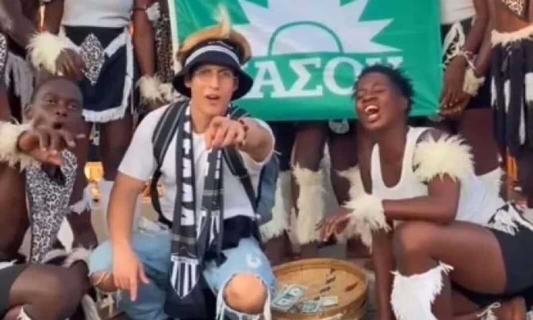 Μάλιστα οι ντόπιοι κρατούν σημαίες με τον πράσινο ήλιο ενώ ο νεαρός ακούγεται να λέει «είμαστε στη Ζιμπάμπουε και υποστηρίζουμε ΠΑΣΟΚ».