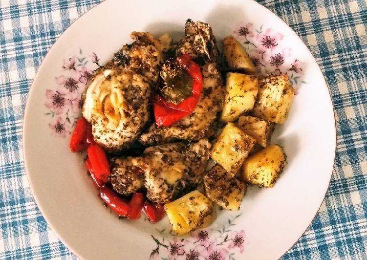 Στην συνέχεια προθερμαίνετε το φούρνο στους 200 βαθμούς και το βάζετε για ψησιμό πάνω κάτω ενώ καθαρίζετε τις πατάτες και τις πιπερίες.