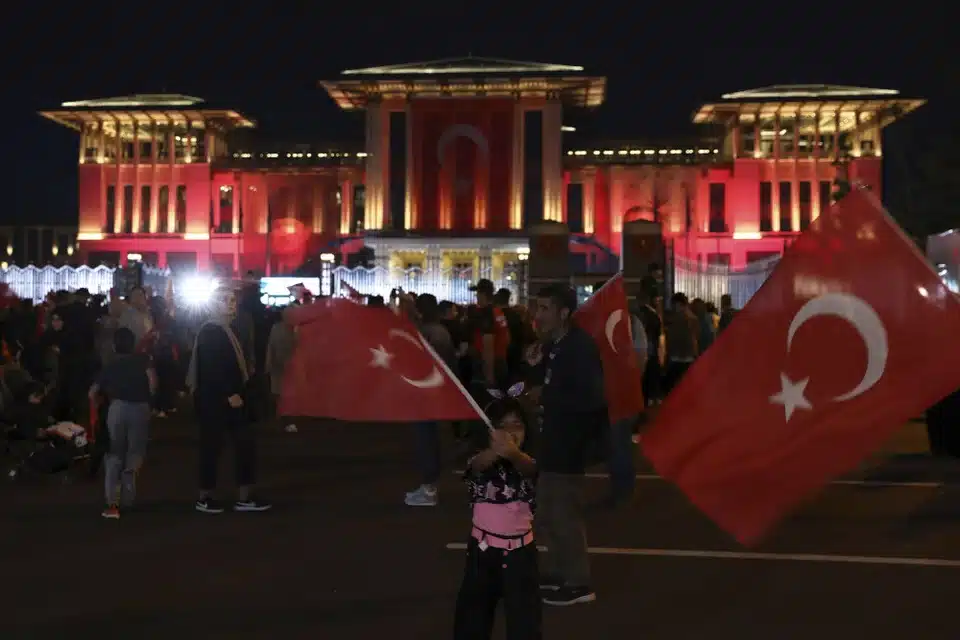 Ο Ρετζέπ Ταγίπ Ερντογάν πραγματοποίησε θριαμβευτική ομιλία μπροστά σε χιλιάδες υποστηρικτές του και έξω από το Λευκό Παλάτι στην Άγκυρα, μετά τη νίκη στις προεδρικές εκλογές.