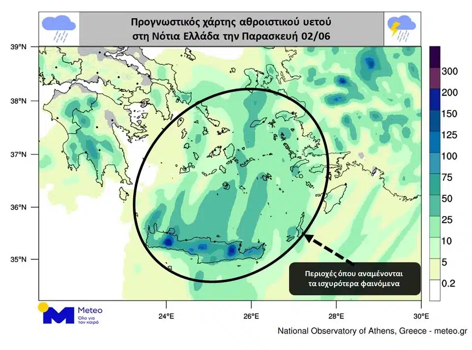 Στον προγνωστικό χάρτη, αποτυπώνεται η γεωγραφική κατανομή του αθροιστικού υετού στη Νότια Ελλάδα κατά τη διάρκεια της Παρασκευής 02/06.