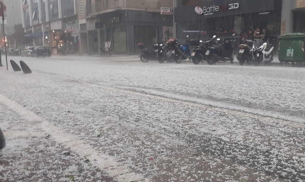 Το χαλάζι έχει μέγεθος φουντουκιού, με αποτέλεσμα οι δρόμοι και τα πεζοδρόμια να δείχνουν χιονισμένα.